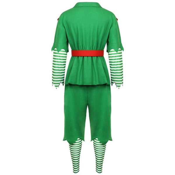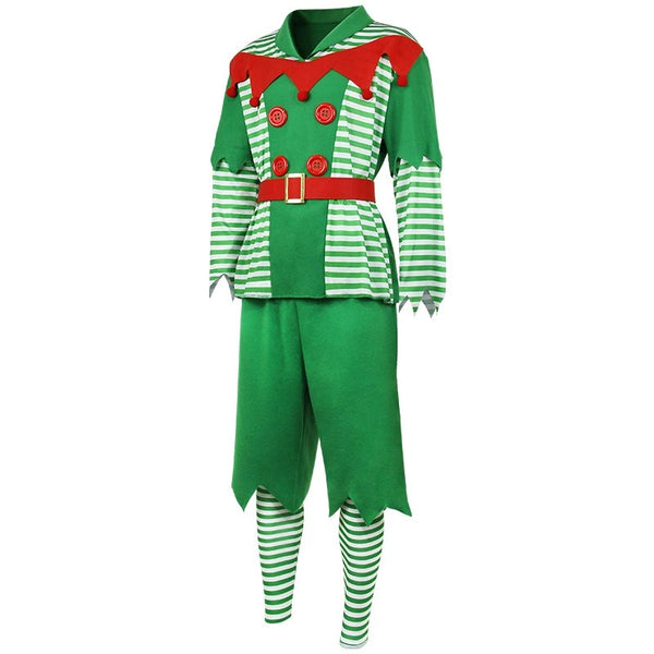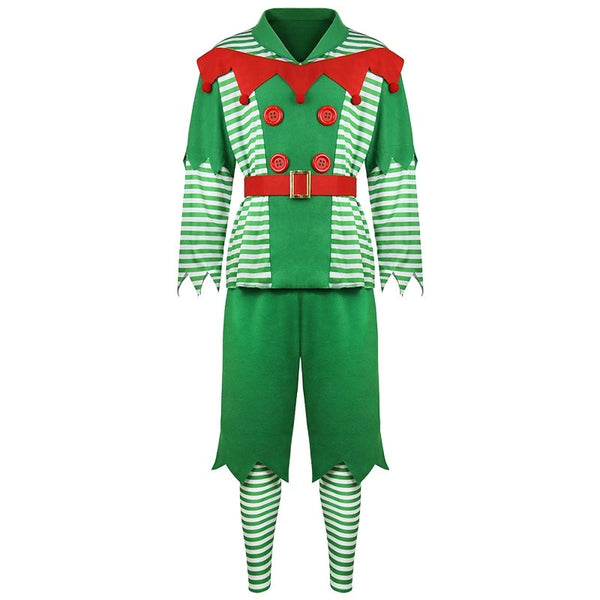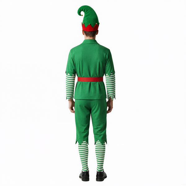 Men Elf Costume Christmas Party Oufit Green Tops Pants Hats and Shoes Full Set.