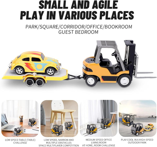 Get ready to have a blast with this pint-sized remote control forklift! This 1/64 scale alloy beauty packs serious fun into a tiny package, complete with a matching trailer for double the excitement.