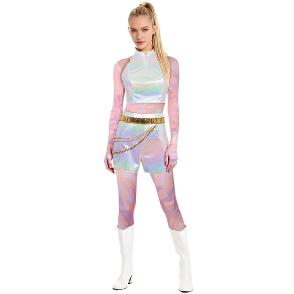 • Costume -1 includes top, shorts, metal chain, belt, and waist accessory.