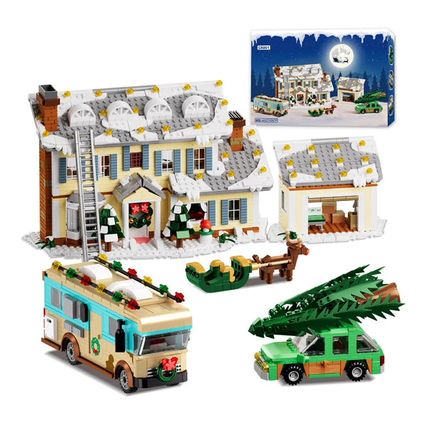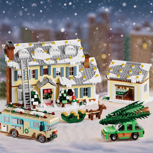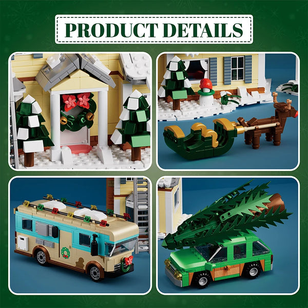 It is a multi-module kit that can be assembled into a complete, festive scene, which includes the main family home, a detached garage, Cousin Eddie's RV, a station wagon with a Christmas tree, and a sleigh with reindeer, all working together to evoke a warm Christmas atmosphere.