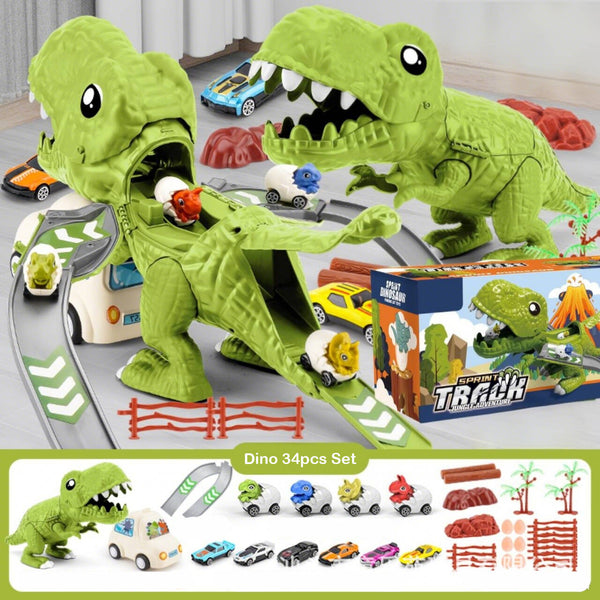 The set includes a fun sliding track with a one-touch launch mechanism, allowing children to propel the dinosaur car for exciting races and action-packed adventures.