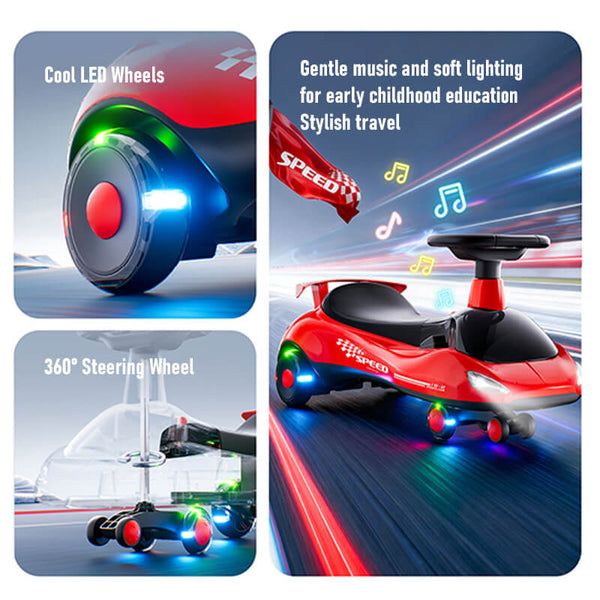 It features dazzling LED lights, engaging early learning music, and a sporty racing design that lights up your child’s playtime while ensuring safe, smooth gliding.