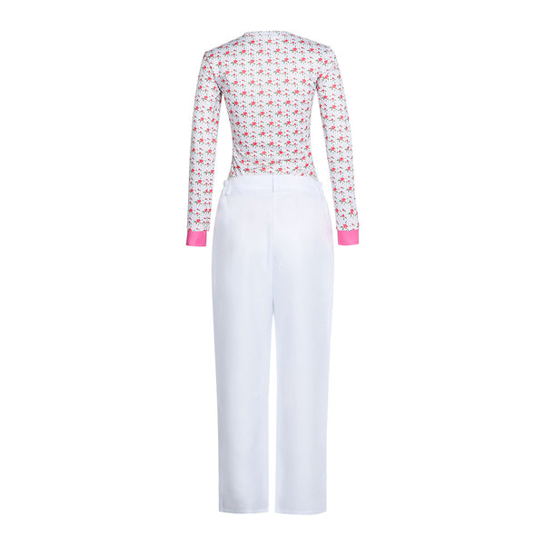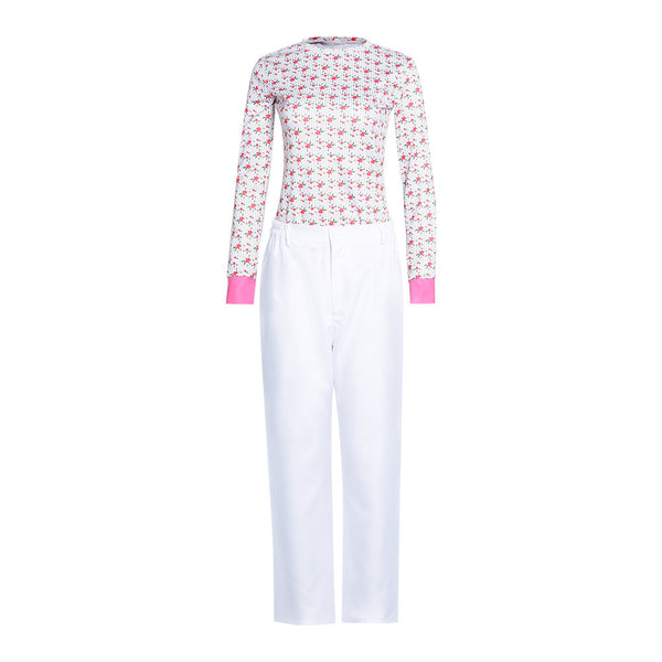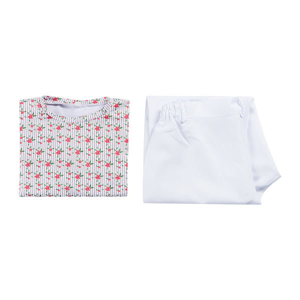Adult El Costume White Floral Print Top and Pants Outfit for Cosplay Themed Parties.