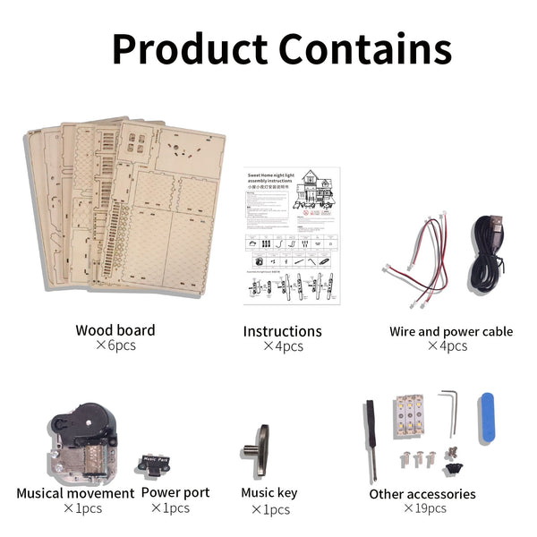 - The finished house displays a charming pastoral cottage scene illuminated by warm lighting, while the music box resembles a vintage European suitcase with intricate carved details, adding a touch of romantic appeal.