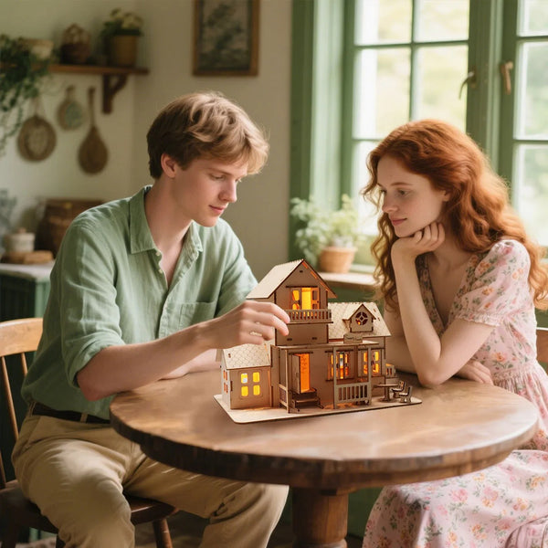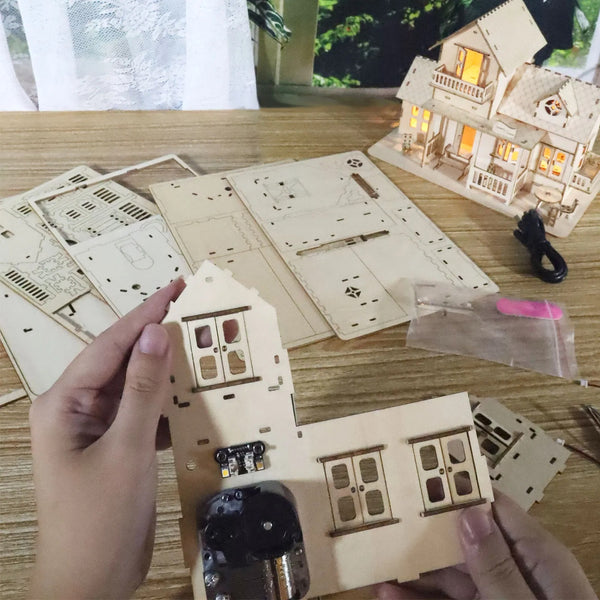 - The miniature house puzzle consists of 126 laser-cut pieces that assemble into a detailed structure with a slanted roof, openable doors and windows, courtyard furniture, and integrated hidden LED lighting.