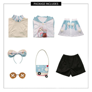 • The costume full set include: 1x hoodie, 1x pair of shorts, 1x sweatshirt, 1x bag, 1x headband, 1x pair of glasses.