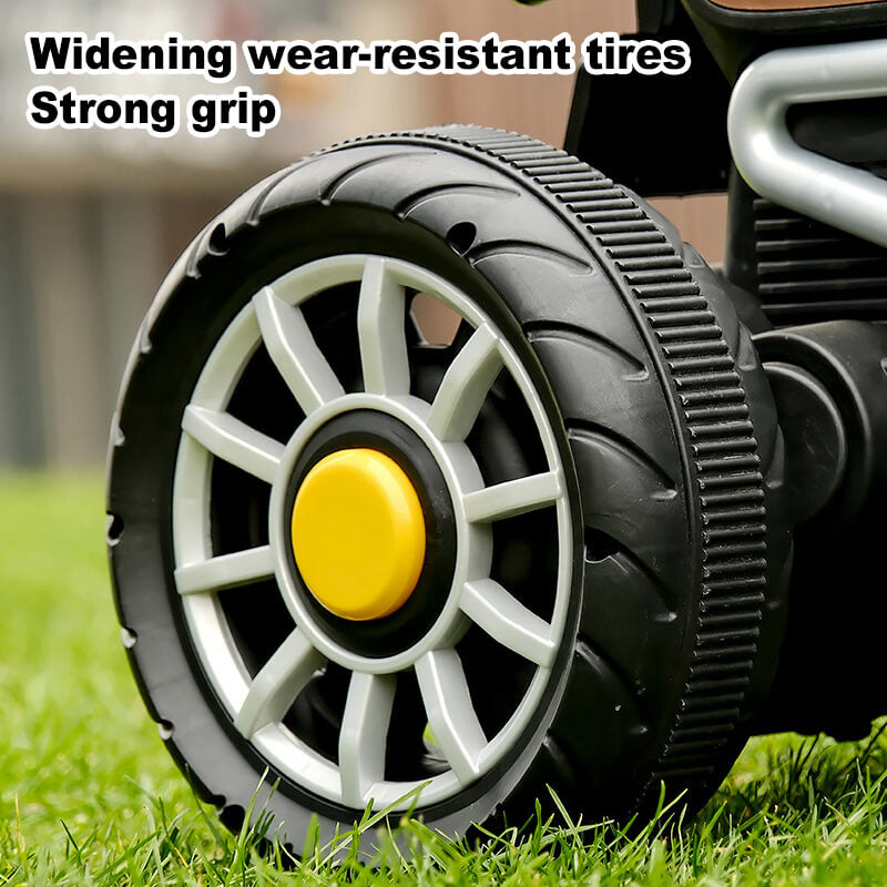 All-Terrain Tires: Rugged, extra-wide tires with deep treads conquer grass, gravel, pavement, and mild slopes, maintaining traction in wet or dry conditions.